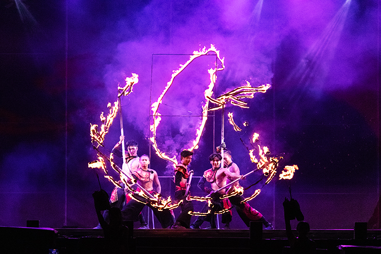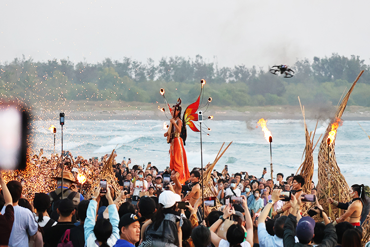 漁光島的人潮一圈圈聚攏,屏息注視著火球在表演者舞動的身形間穿梭。日落時分,火舞比賽、遊行與開放舞台在海灘輪番上演,展現不同的火焰表演型態。除了提供表演者展示及交流的平台外,現場亦設有體驗區,讓民眾得以在專業火舞者的教學下,親自操作火舞道具。夜幕降臨,主舞台迎來了「火神祭」的重頭戲。主秀中,即將成真火舞團以火焰勾勒出台灣輪廓,外側圍繞的火龍為島嶼而舞。
