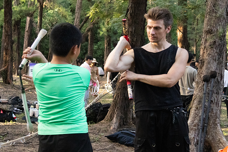 匈牙利火舞表演者教導孩童操作雙節棍。圖/黃舒愉攝