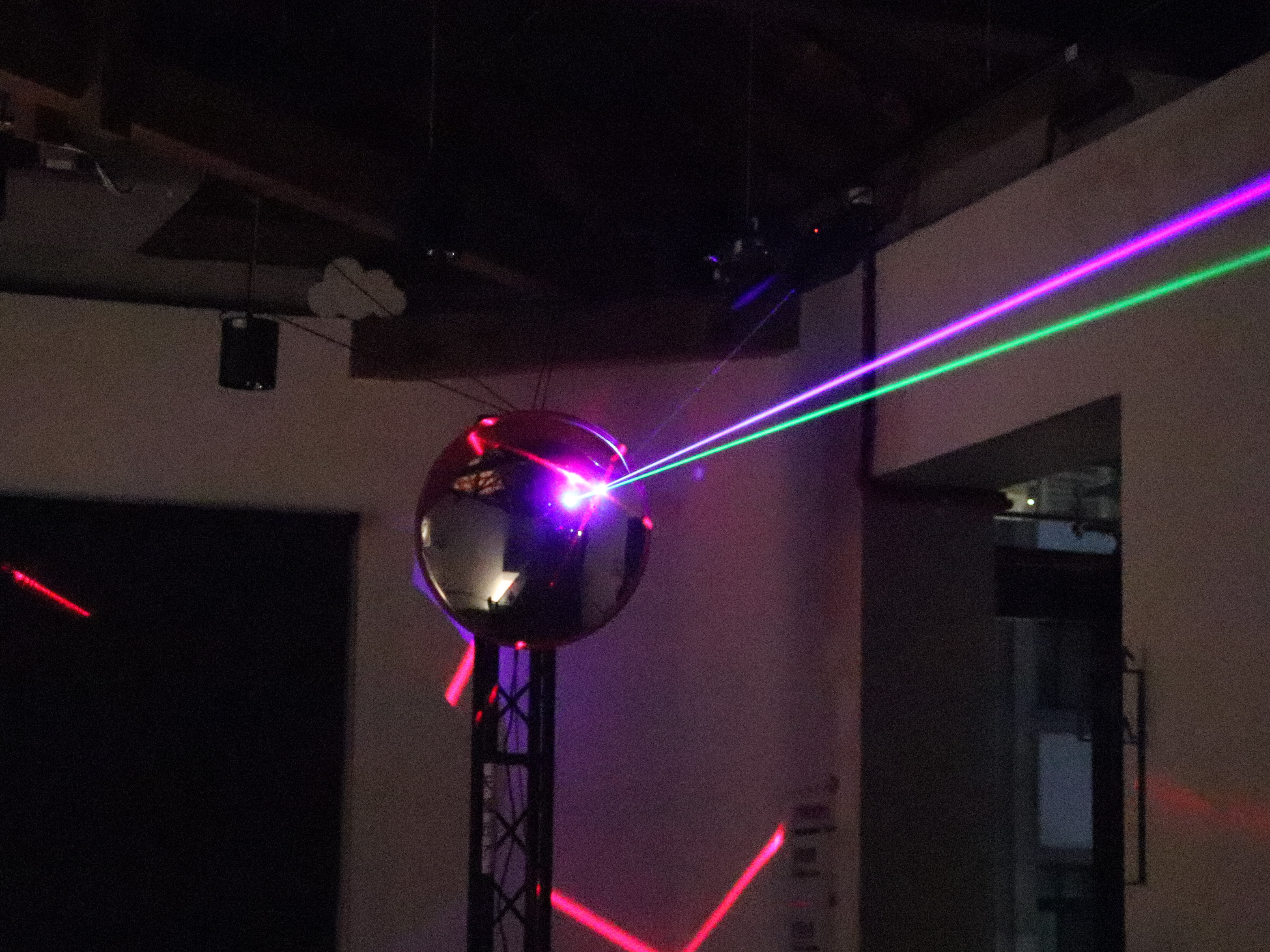 聲音裝置〈llyung 河流〉以詩作〈平地人〉為構想,「llyung」為泰雅語「河流」之意,象徵流域既連結山與平地,以及族群的邊界。運用雷射光線易受波紋干擾的特性,在反光鏡的底部設置聲音裝置,讓聲波影響光線的分流、匯流。圖∕ 游宜珊攝