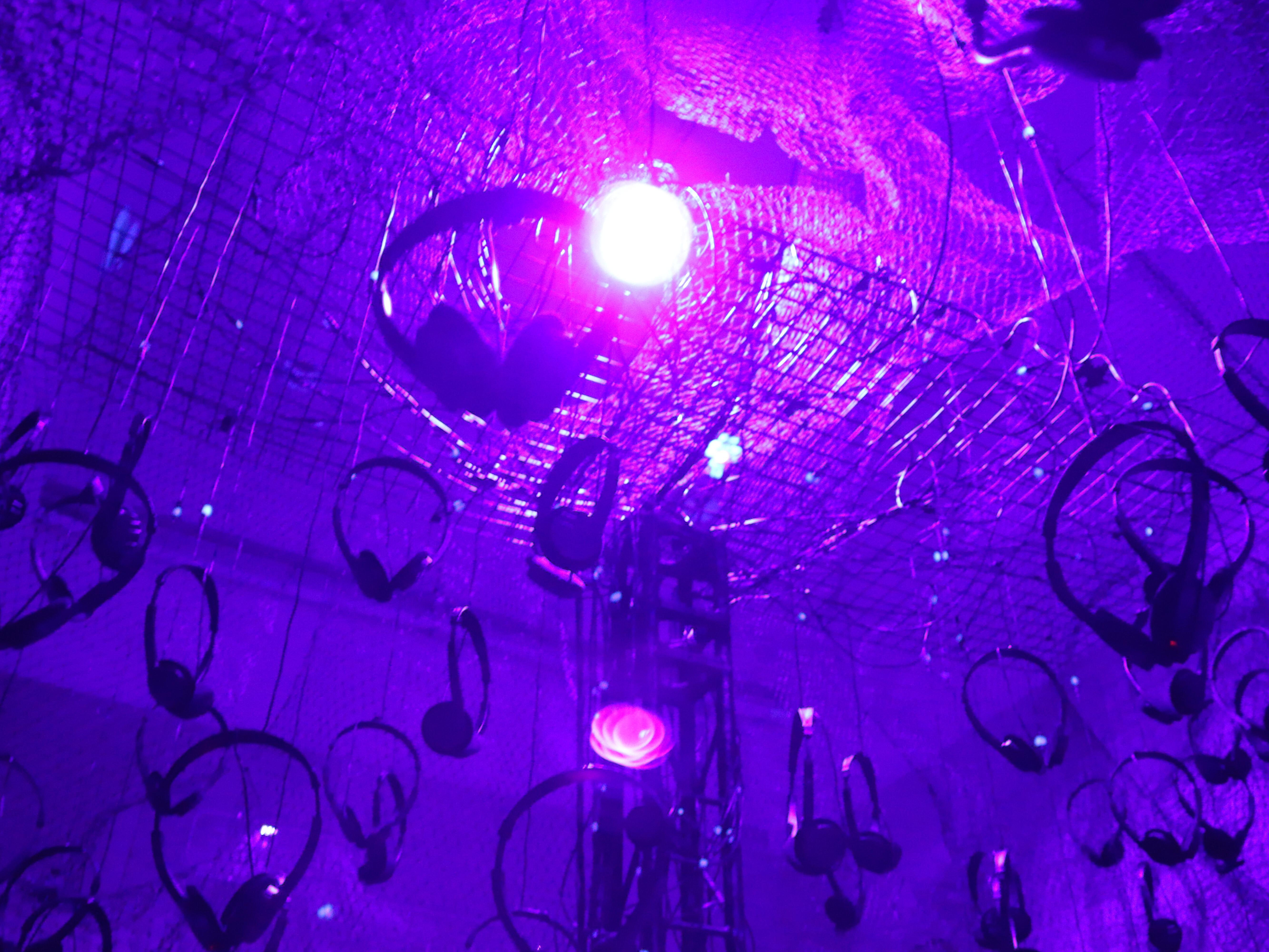 聲音裝置〈bling 洞穴〉以詩作〈口傳史詩〉為主體,展場耳機內碎片化、不完整的語音,呼應圖像詩中逐漸破碎的話語,呈現口傳史詩的消逝。圖∕ 游宜珊攝