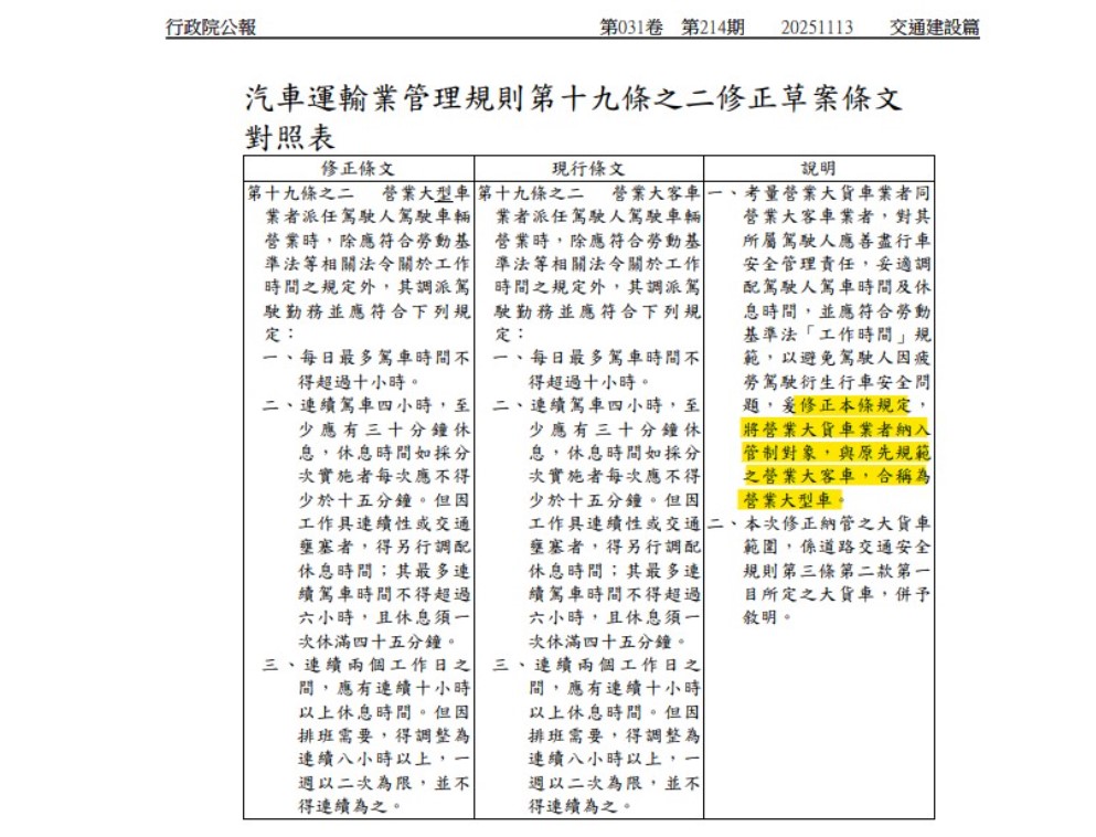 由於營業大貨車過往並未受到《汽車運輸業管理規則》第十九條之二的保障,因此本次法案在原始駕駛時限的基礎上,於車種欄位新增營業大貨車,與營業大客車合併稱為營業大型車。圖/截取自行政院公報